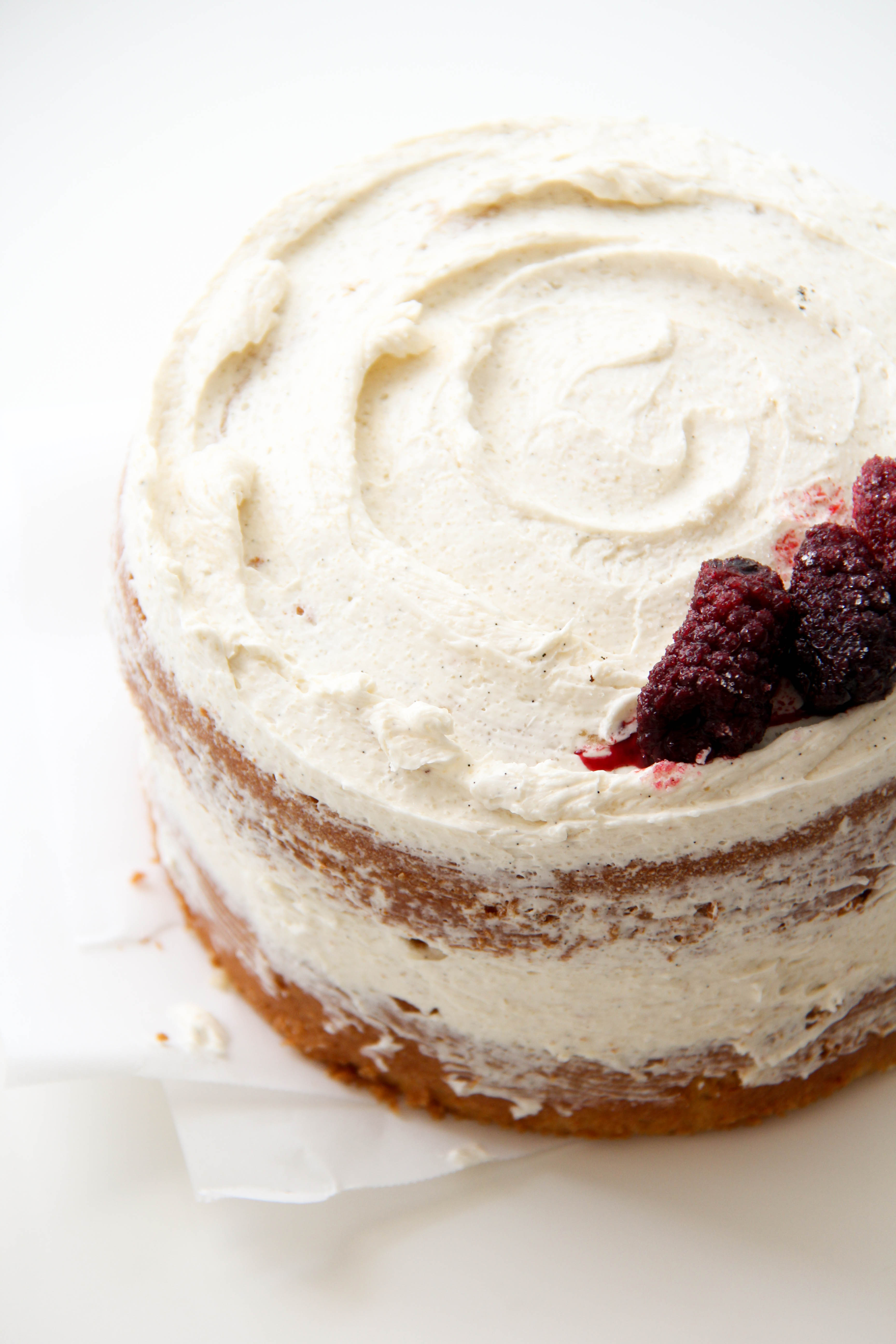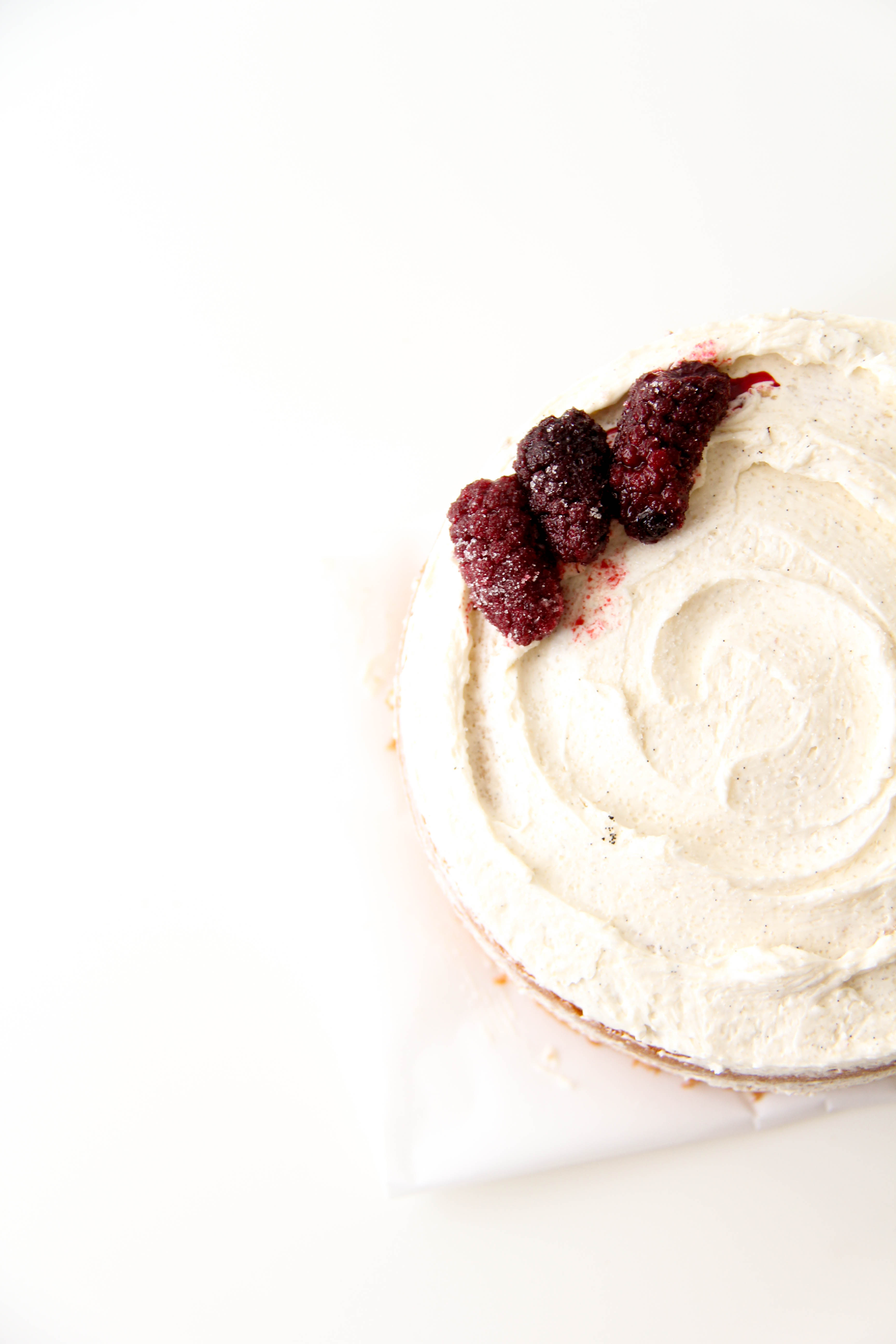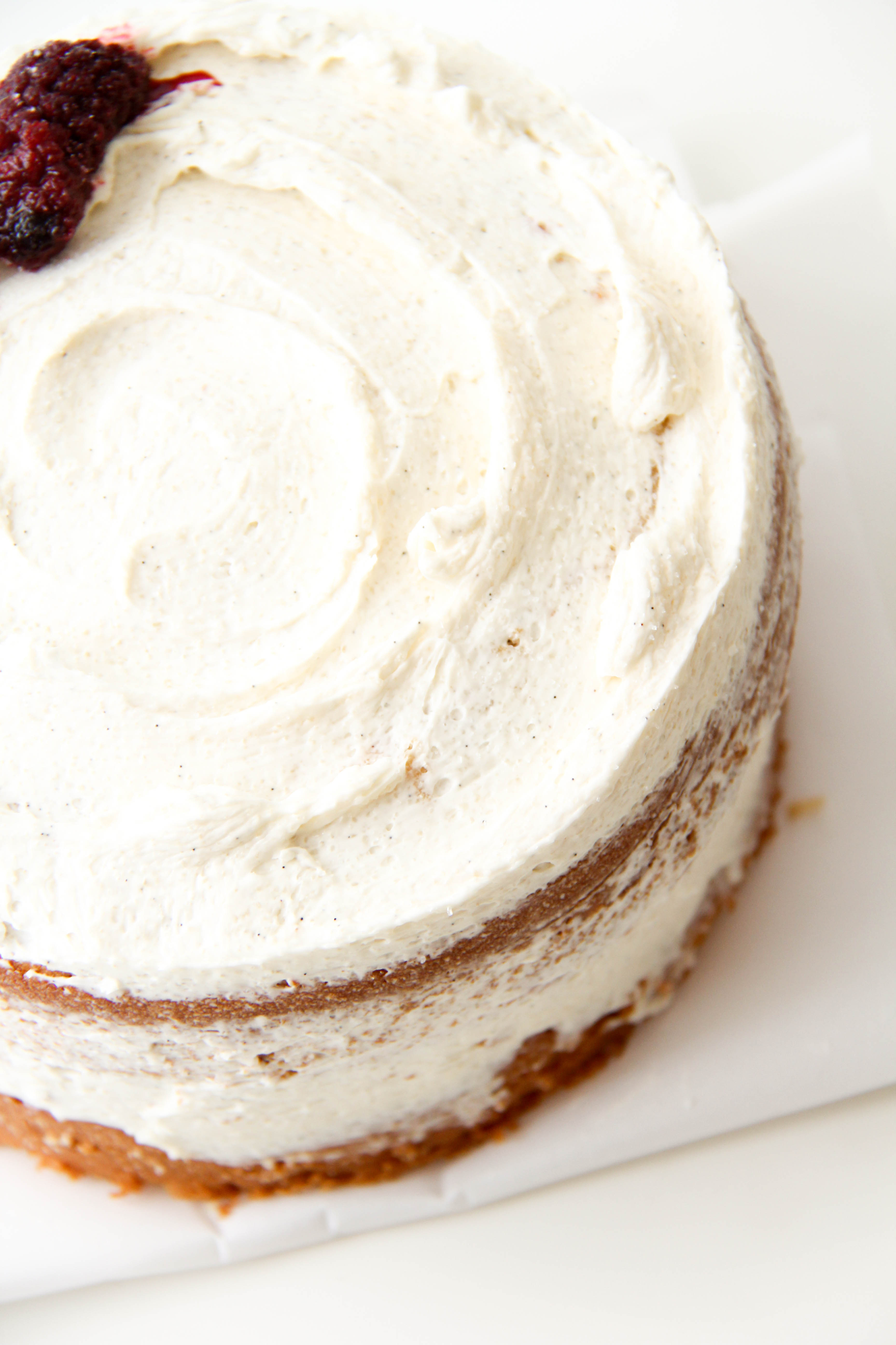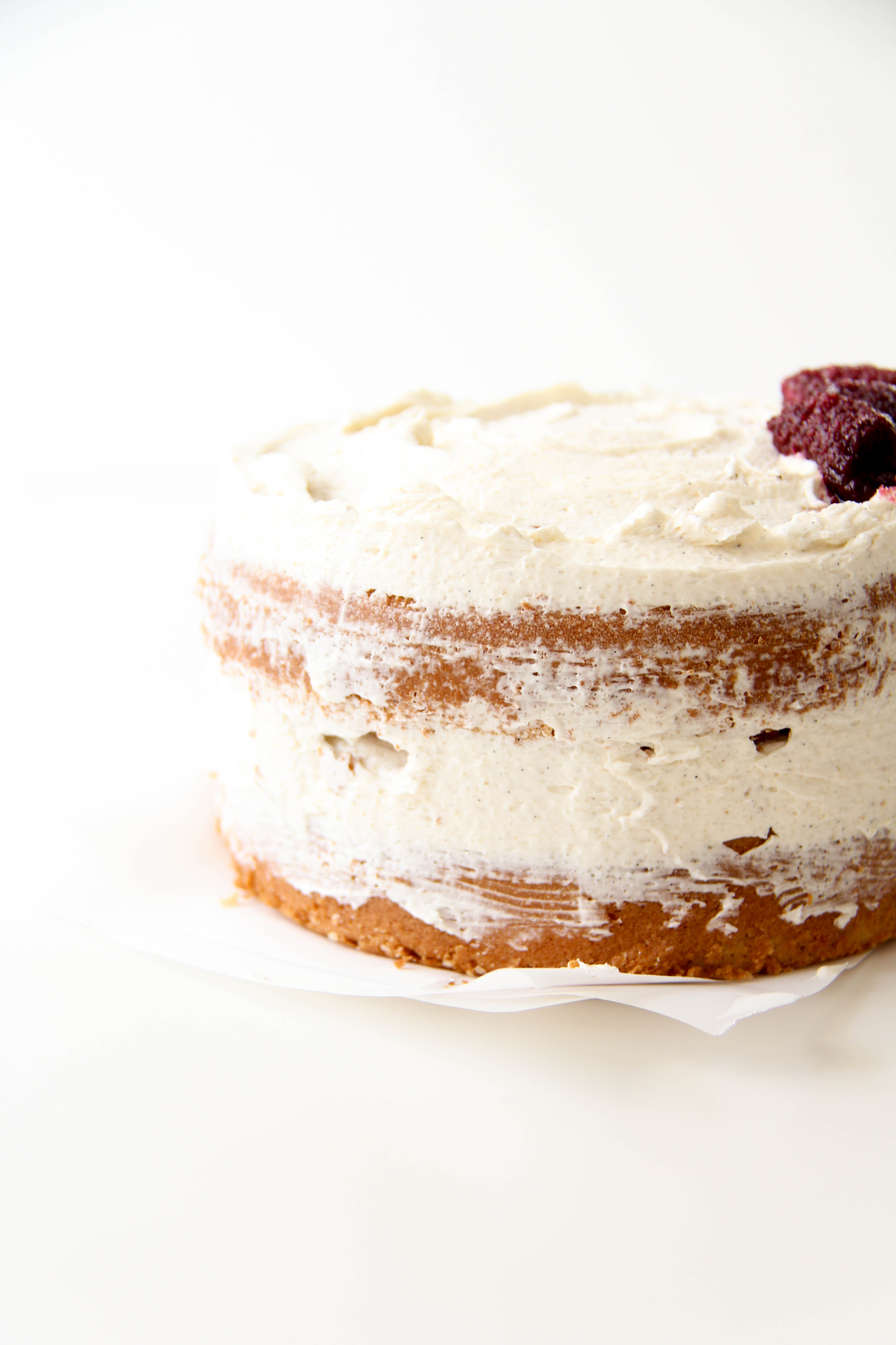 I simply made two 5-inch vanilla cakes, let them cool, topped one with both vanilla frosting and blackberry filling, placed the other cake on top, and spread vanilla frosting roughly all around.