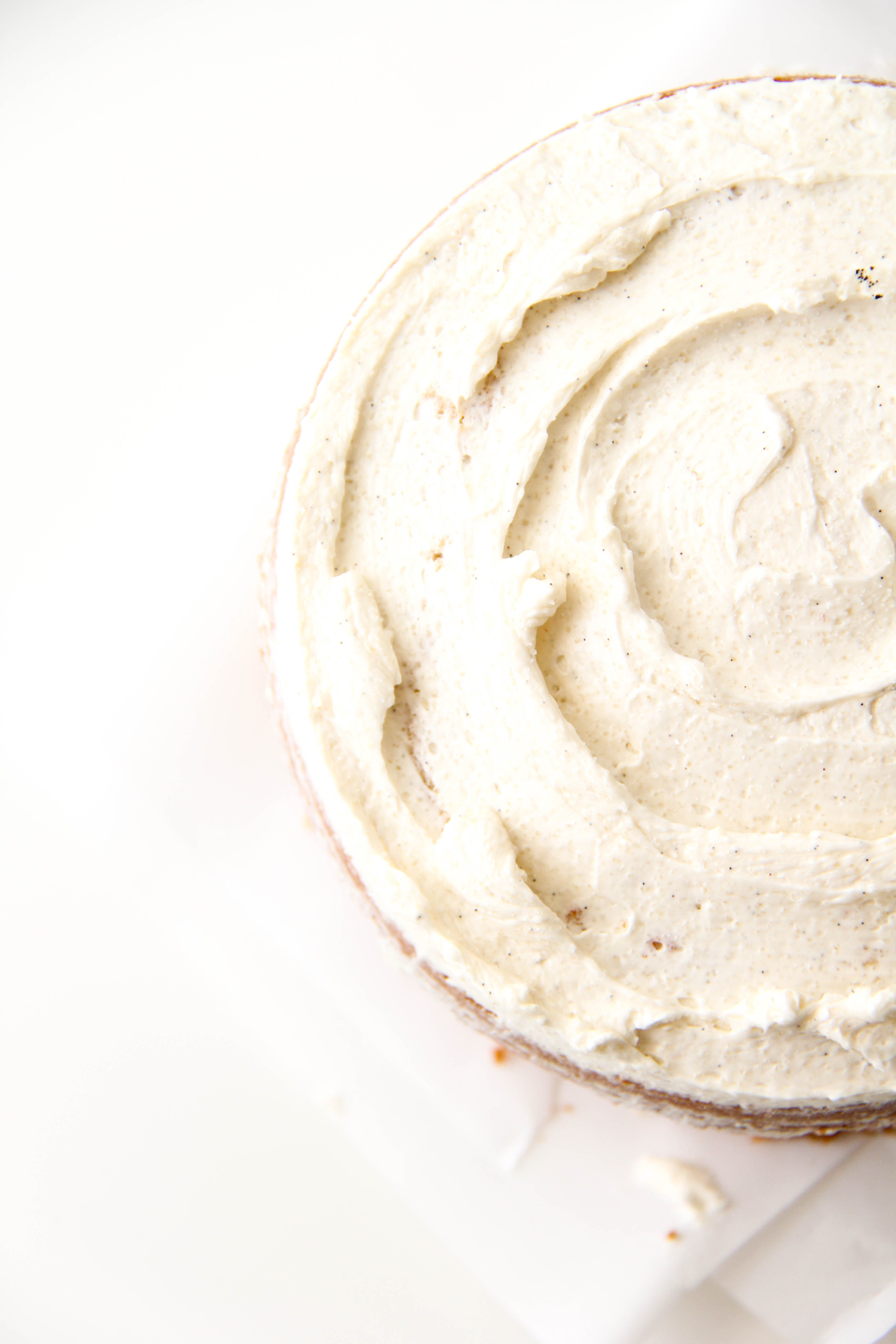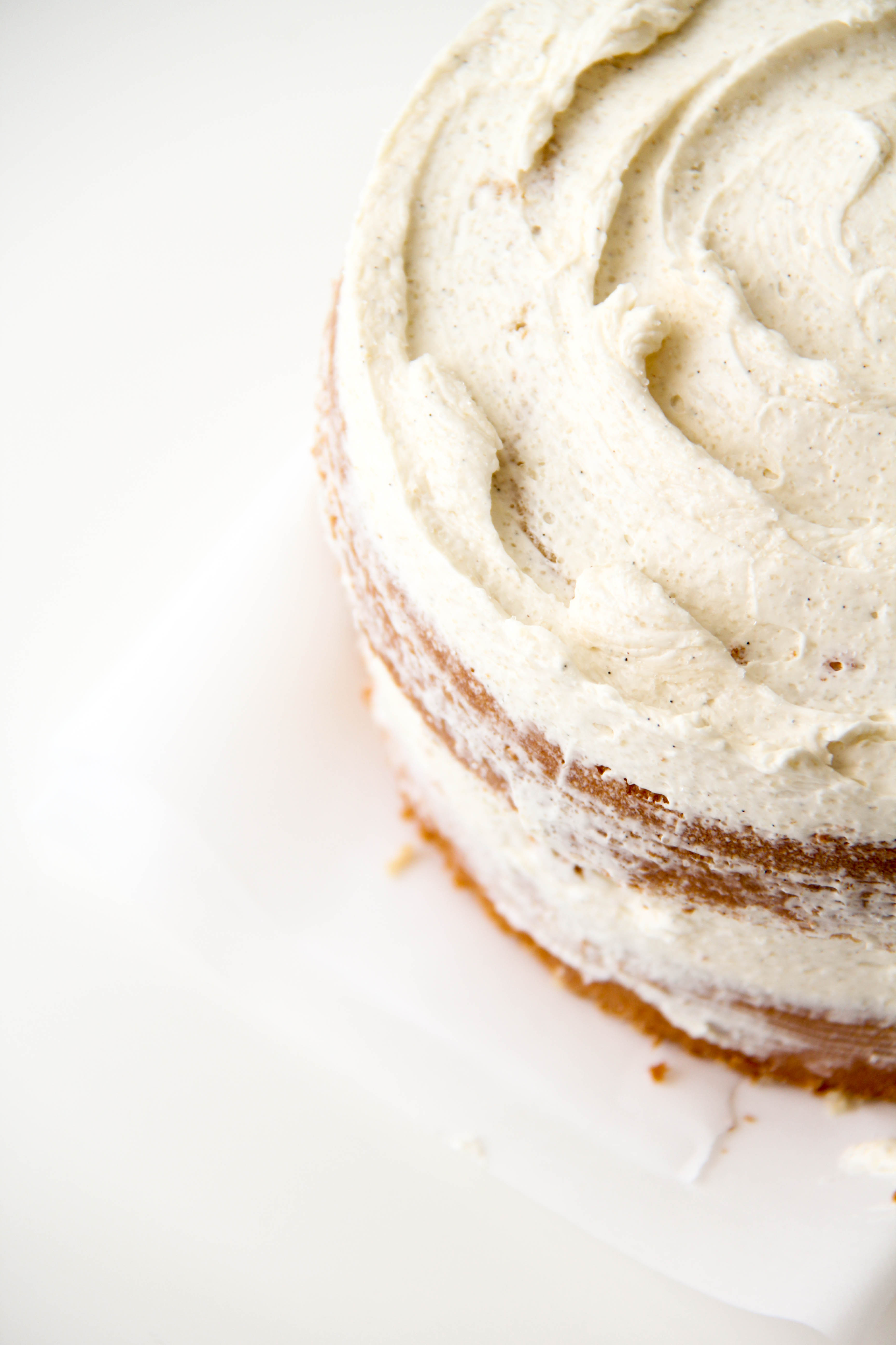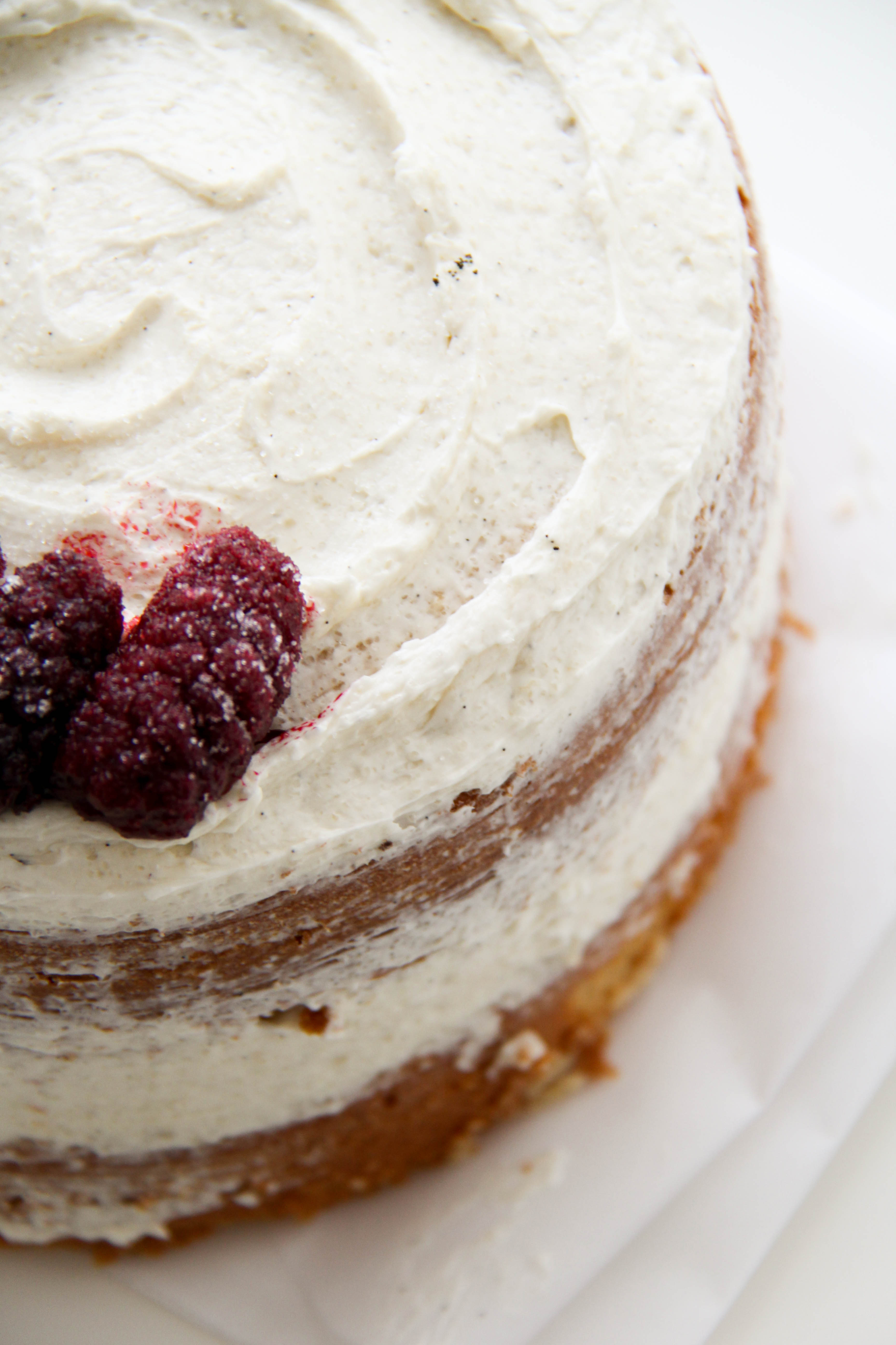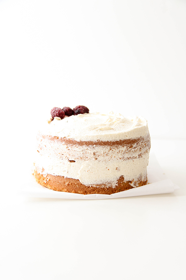I simply made two 5-inch vanilla cakes, let them cool, topped one with both vanilla frosting and blackberry filling, placed the other cake on top, and spread vanilla frosting roughly all around.