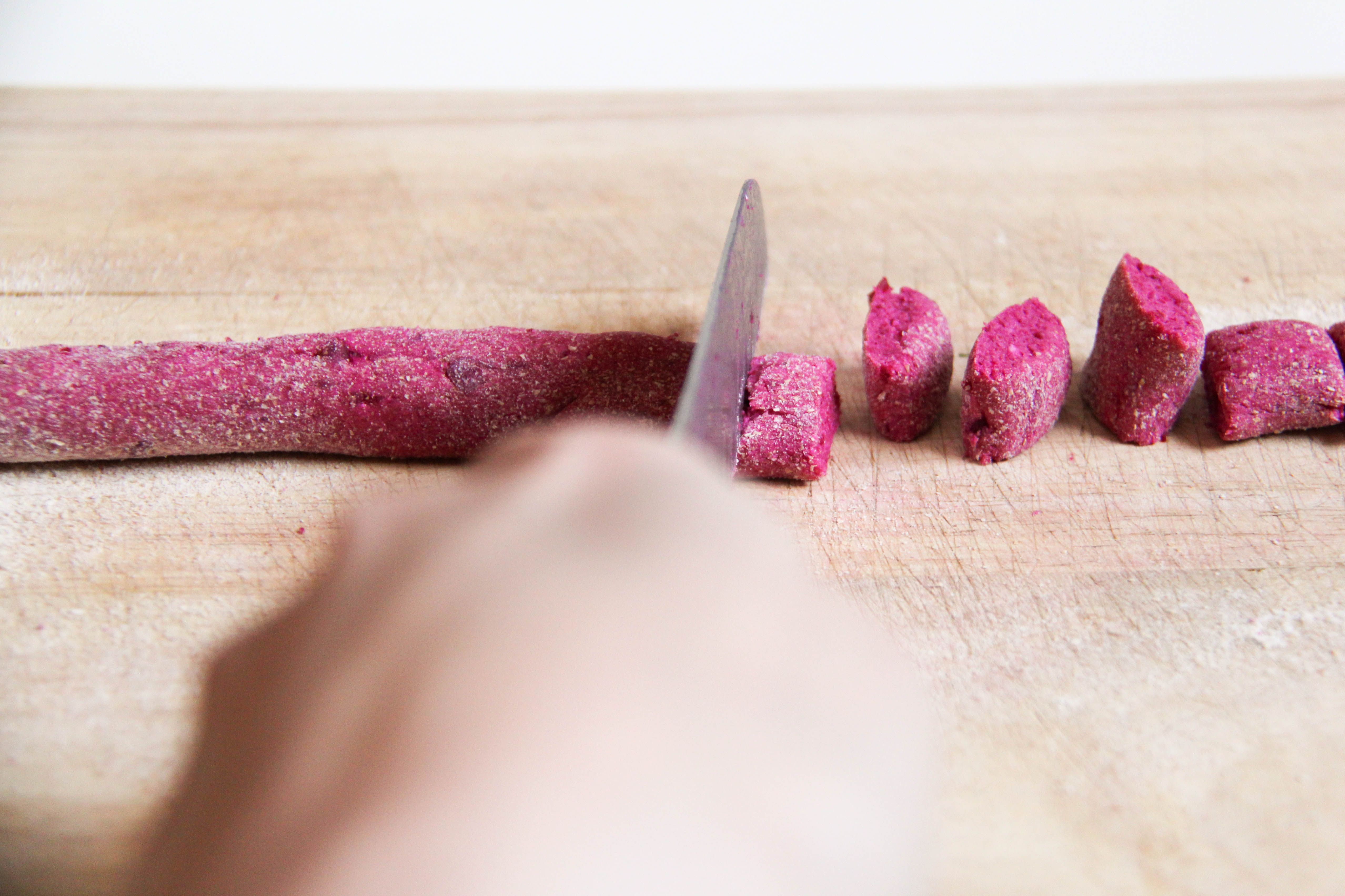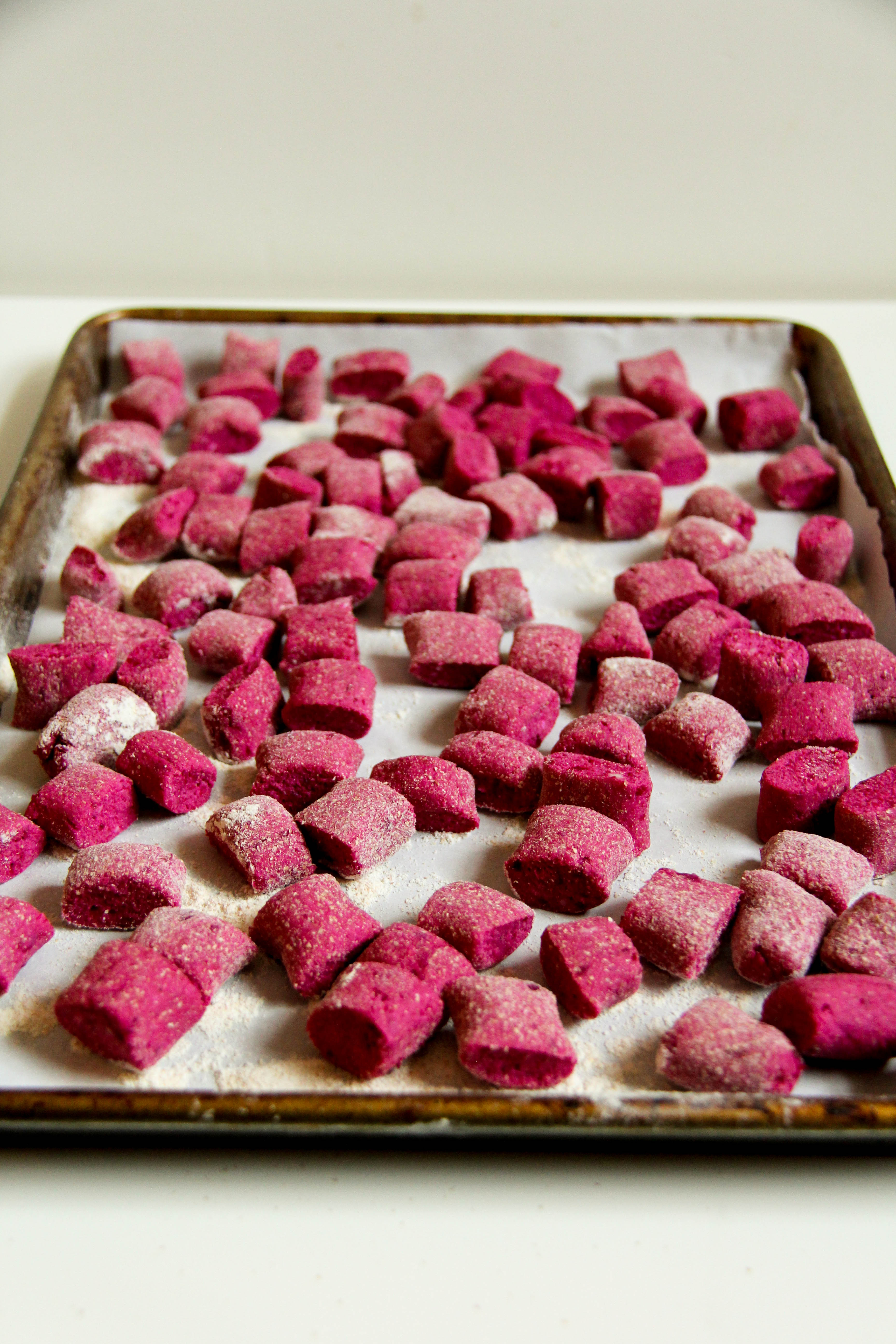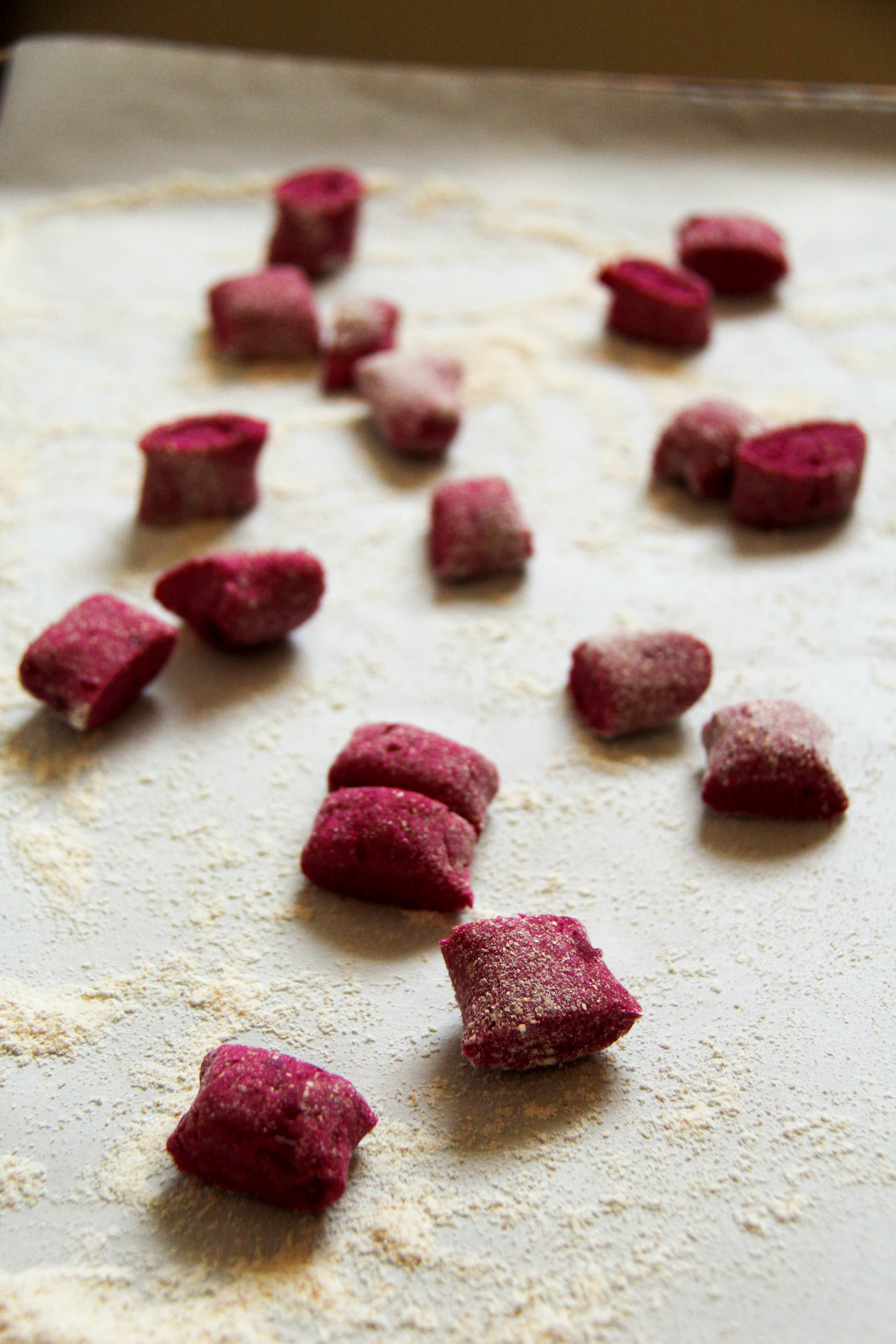 3. Your beet puree does not have to be perfectly pureed. My food processor can’t seem to puree the beets into a perfectly smooth consistency. There are always still some small chunks. I have learned that not only does it not poorly affect the finished product, I quite like the small chunks of beet scattered throughout the cooked gnocchi.