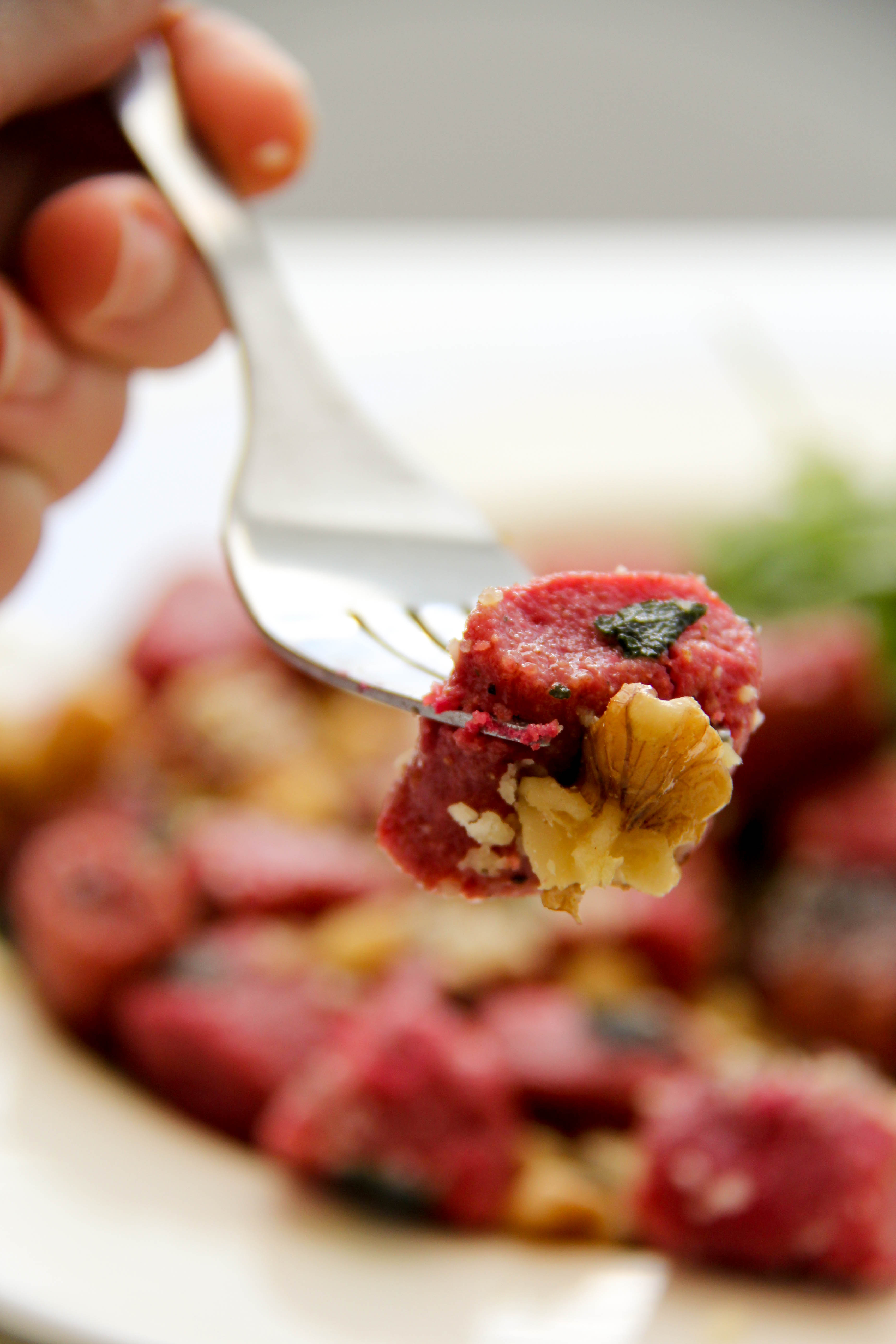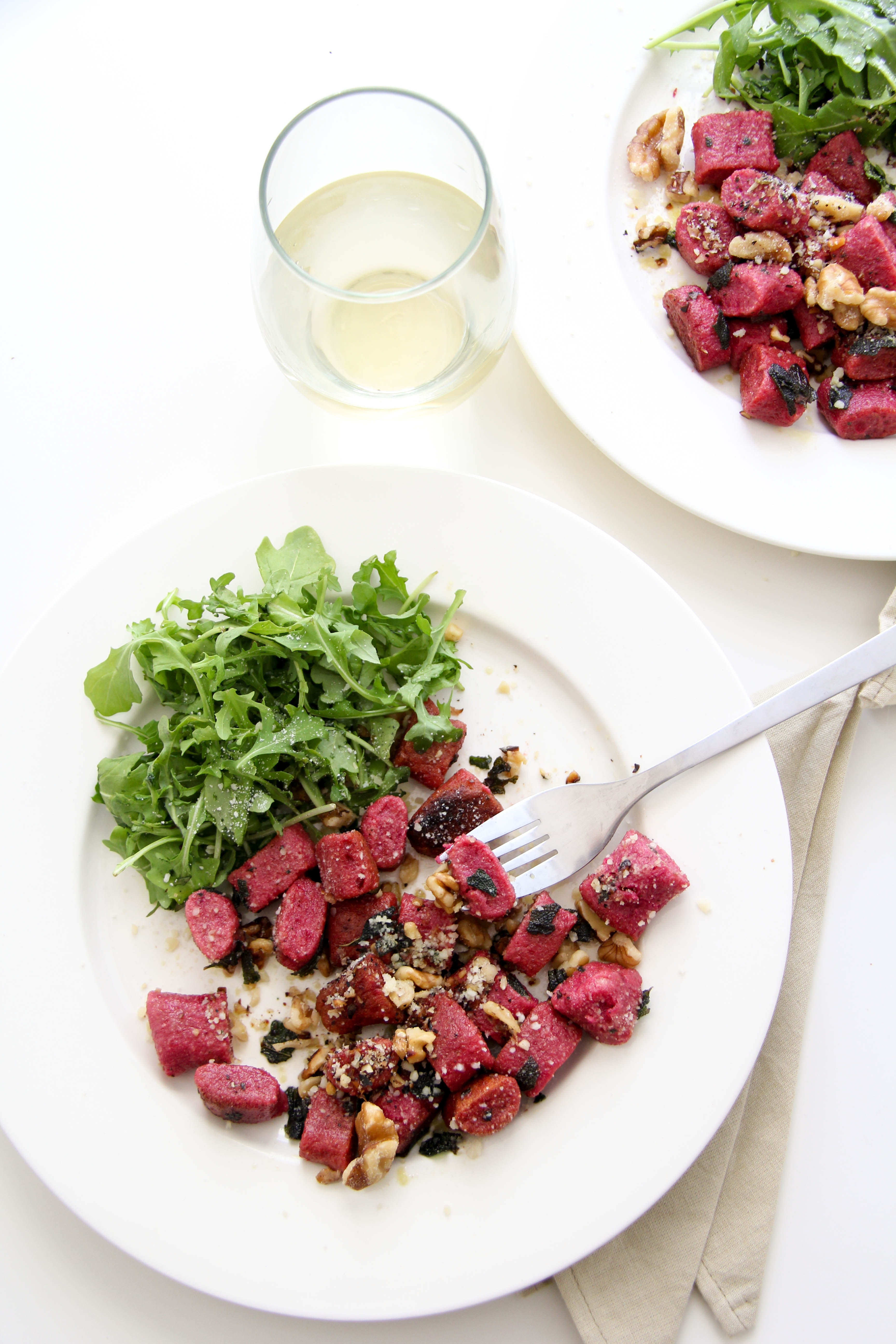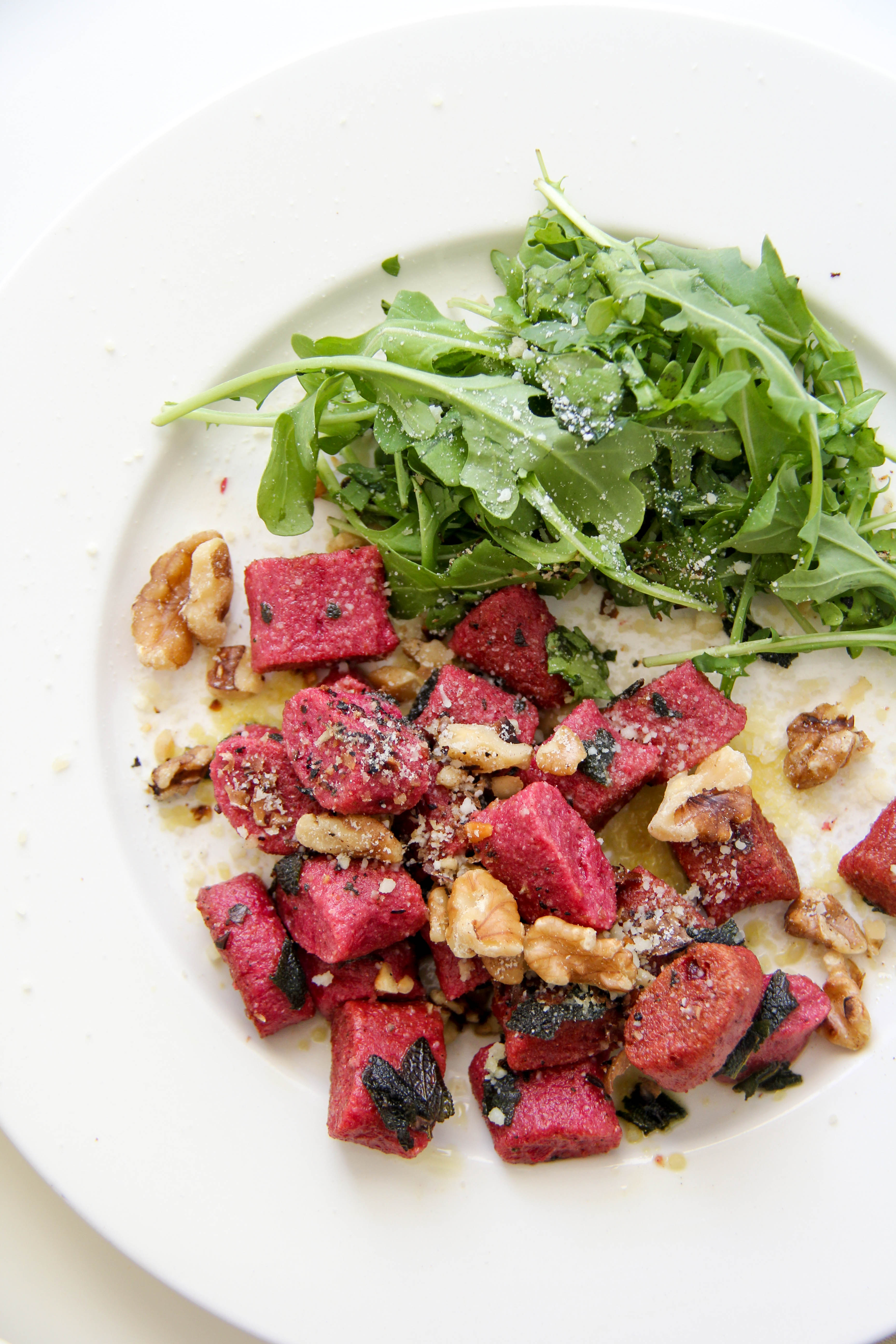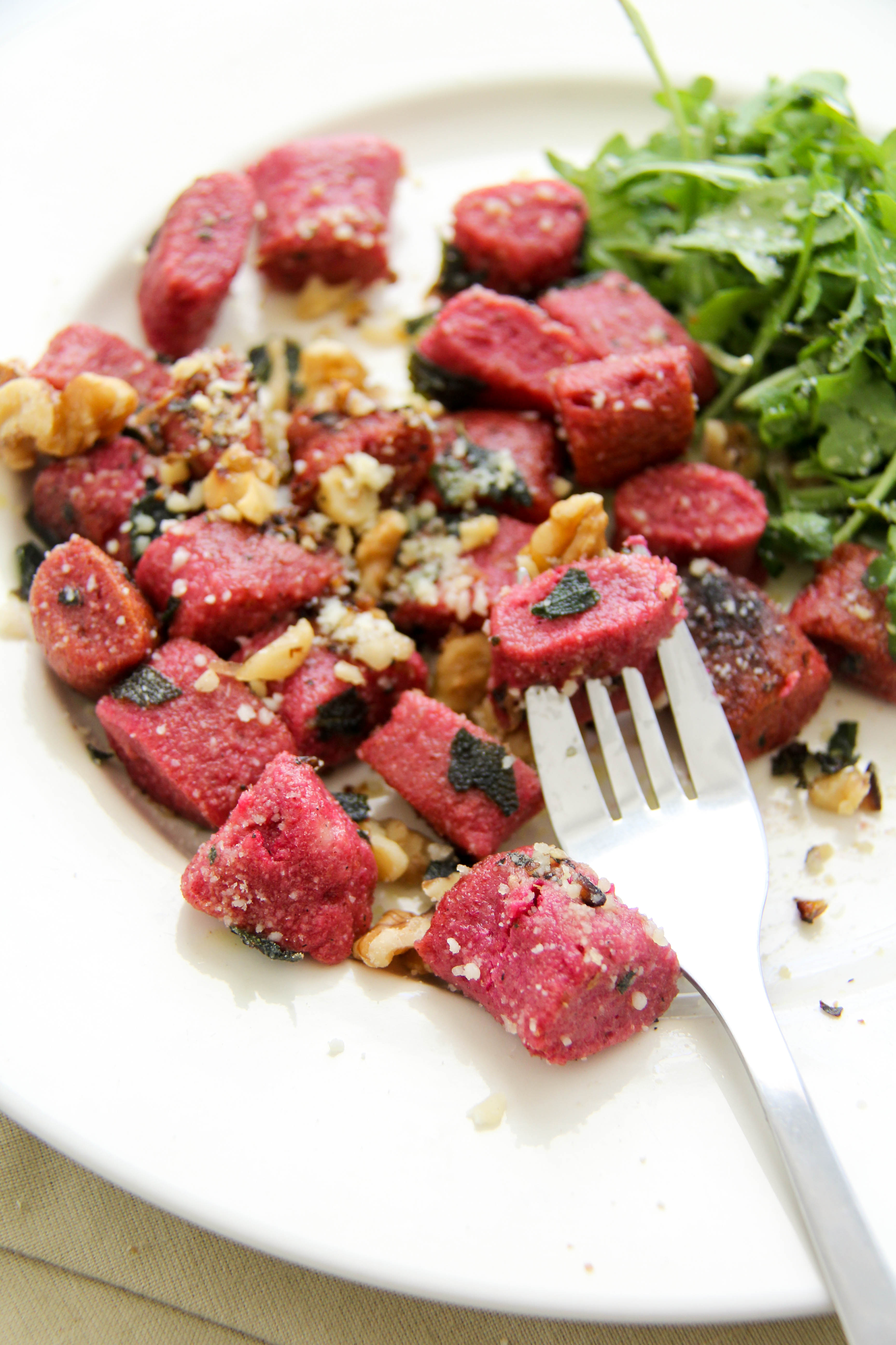 I discovered this recipe, from Food and Wine, at the beginning of winter and have made it every week since, I think. The first time I made it, Greg declared it as his new favorite meal. And even as I’ve made it many more times, it’s still a favorite. It’s just plain good. Homemade beet gnocchi with a butter sage sauce and topped with toasted walnuts and parmesan cheese – need I say more?